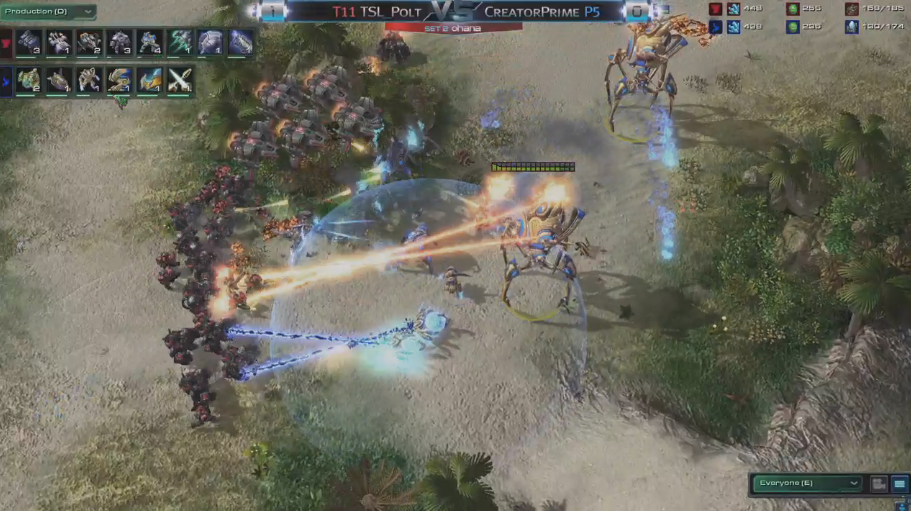 Polt attacks Creator at the perfect time, as Creator's charge research was unfinished and his guardian shields were recovering. Creator poorly positions his army and his colossi are decimated by vikings and he concedes the game.